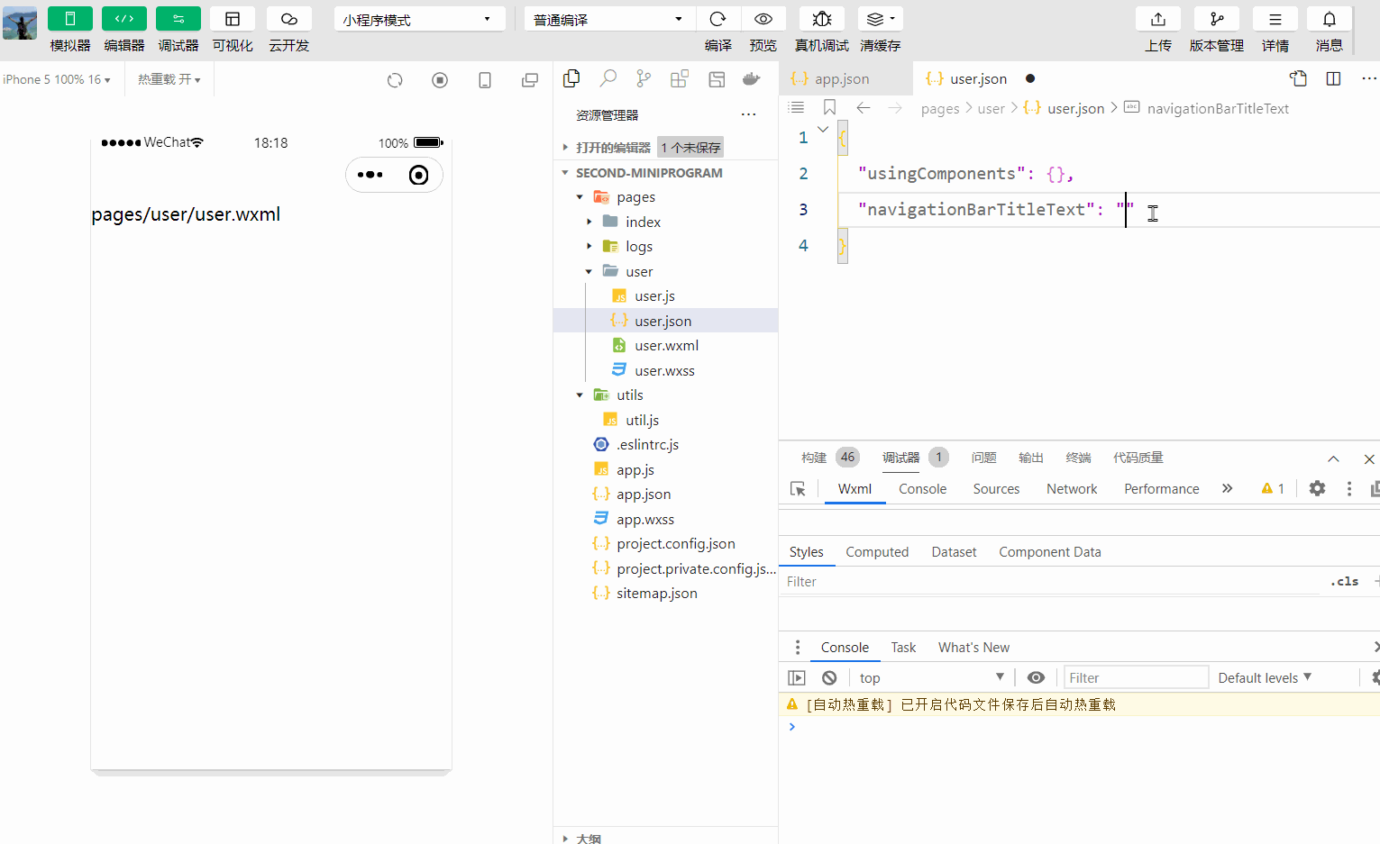 打开app.json公共配置文件,可看到pages数据在这里一个文件夹代表一个页面,也就是index和logs两个页面